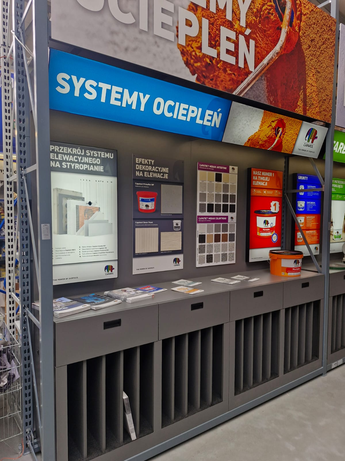 Jednym z projektów była realizacja indywidualnej zabudowy ekspozycyjnej dla marki Caparol w sklepie PSB Mrówka w Tarnowie.