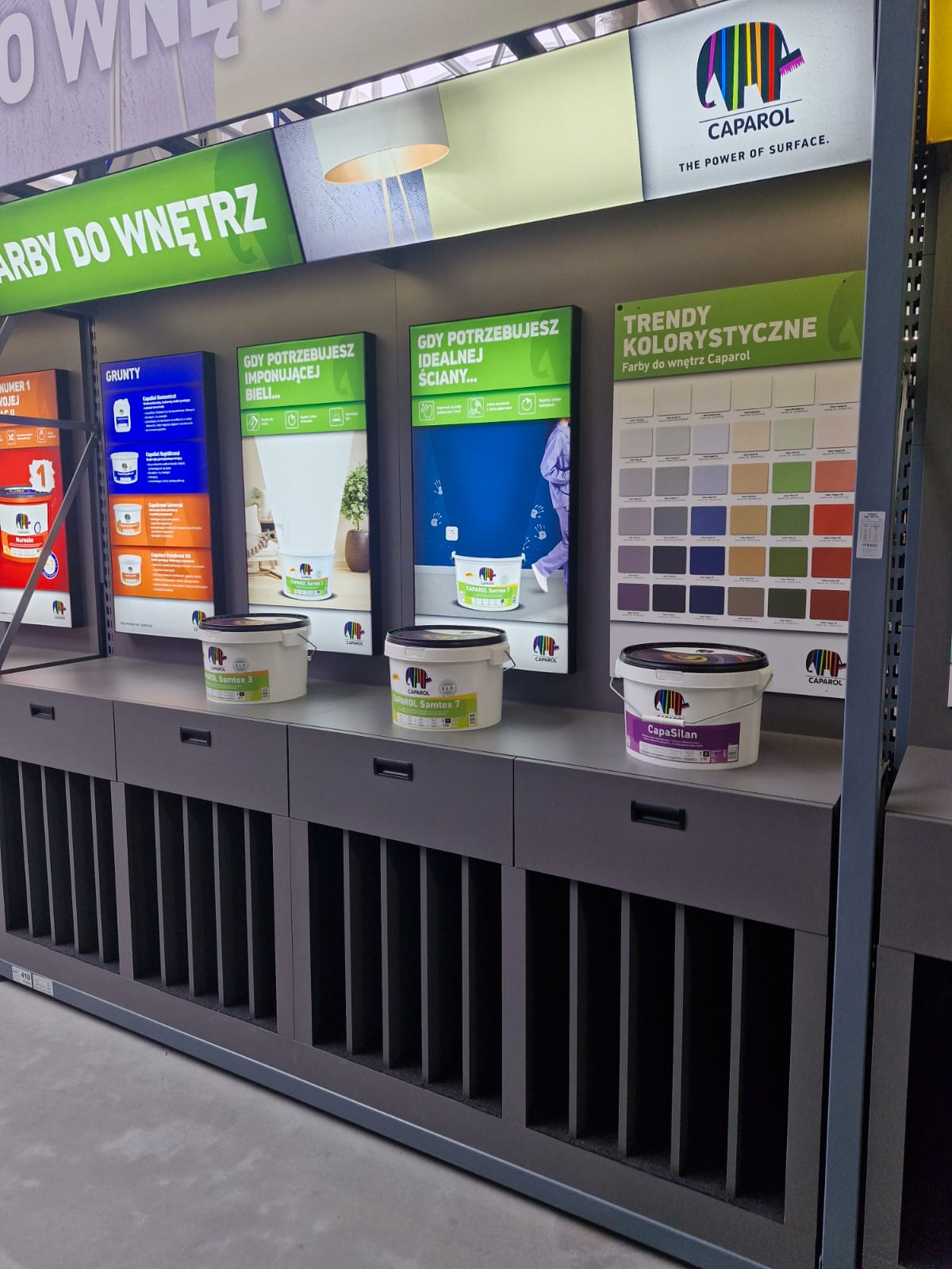 Dodatkowo zamontowaliśmy dostarczone próbki produktowe, które pozwalają klientom zobaczyć i dotknąć realnych wykończeń. W branży farb i materiałów wykończeniowych to element, który realnie wspiera decyzję zakupową.